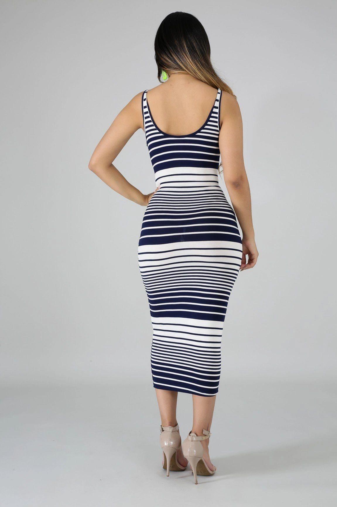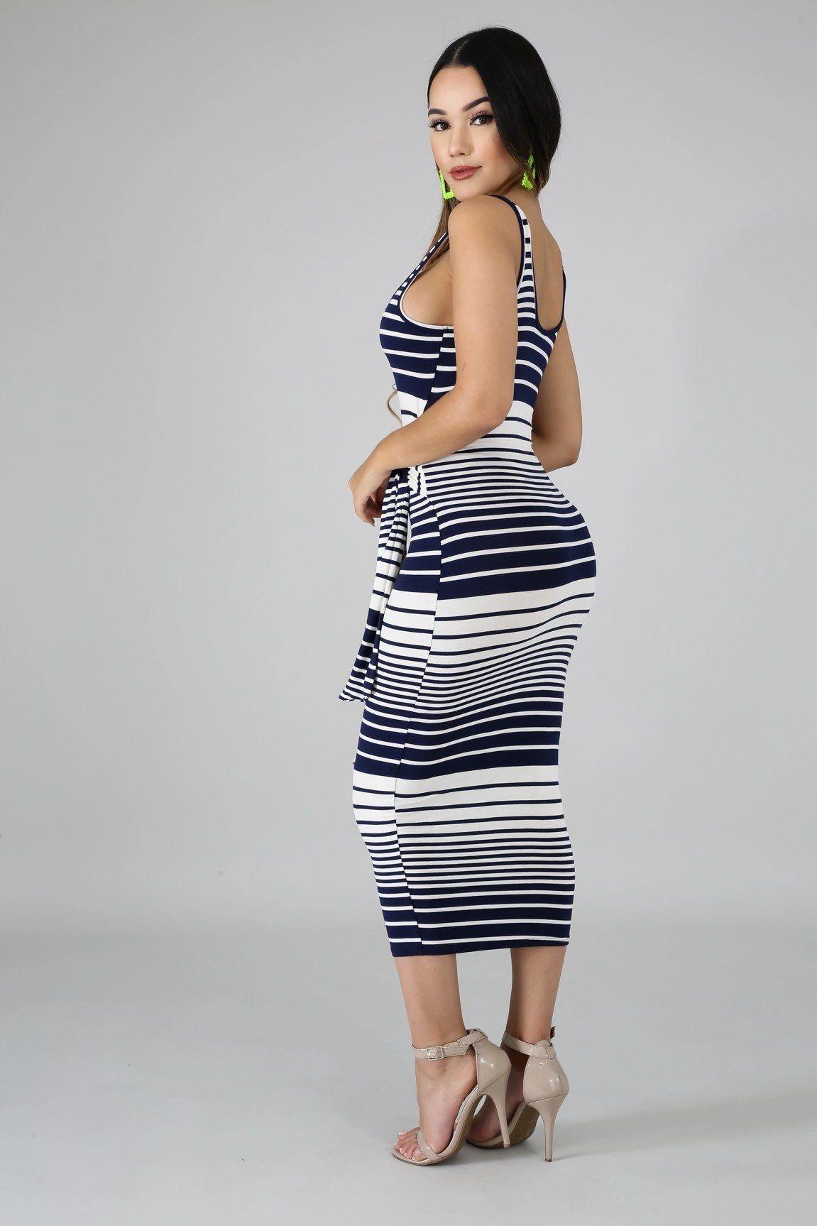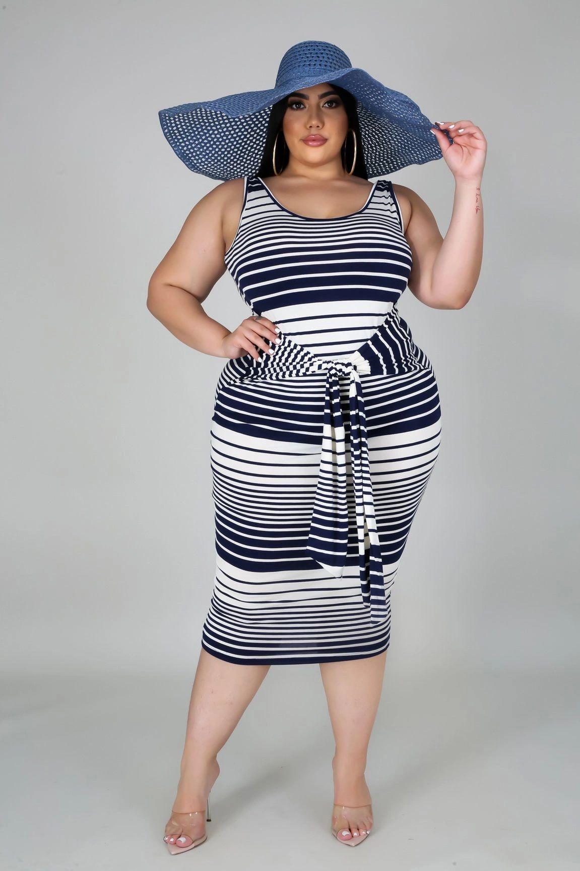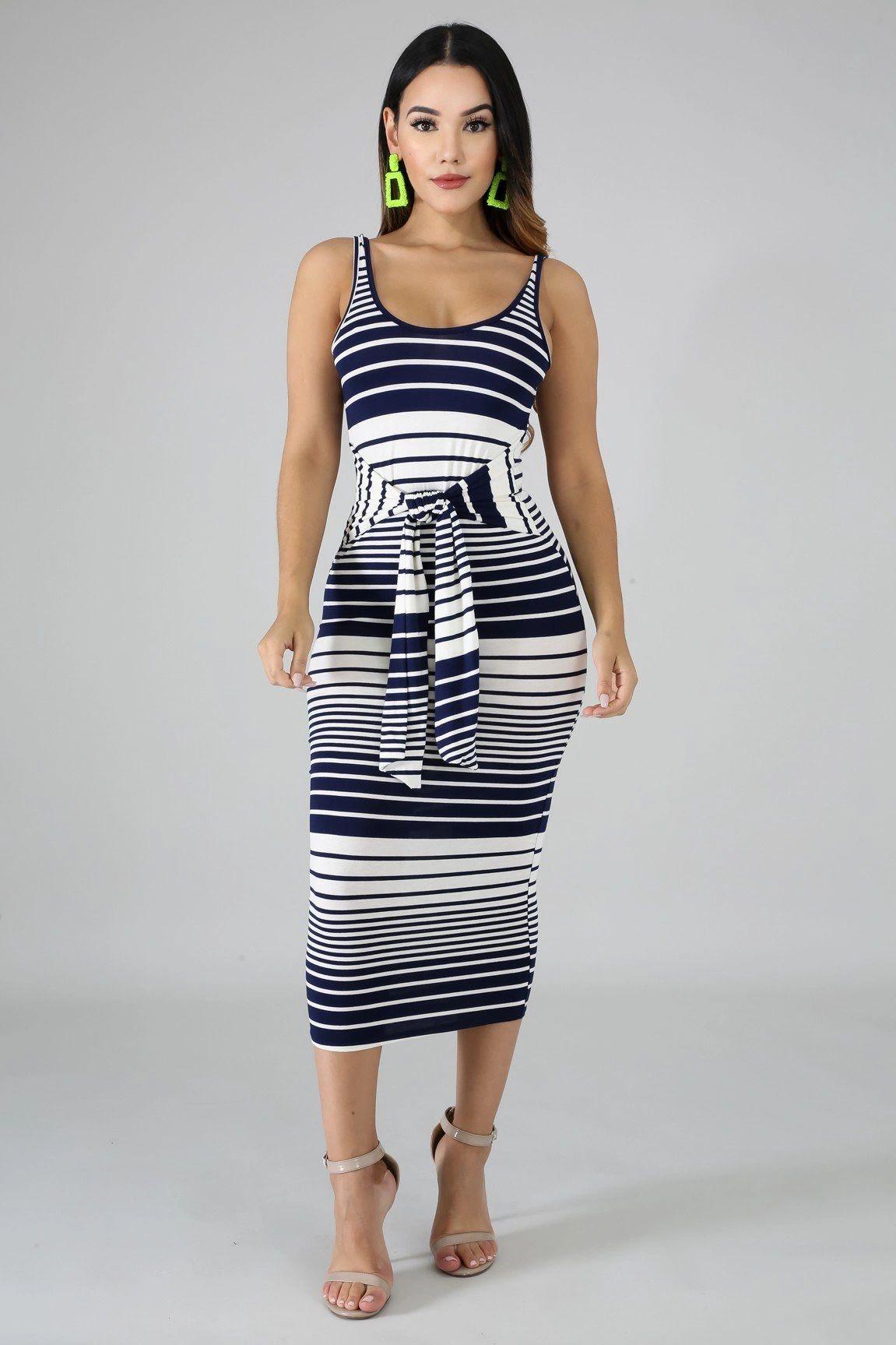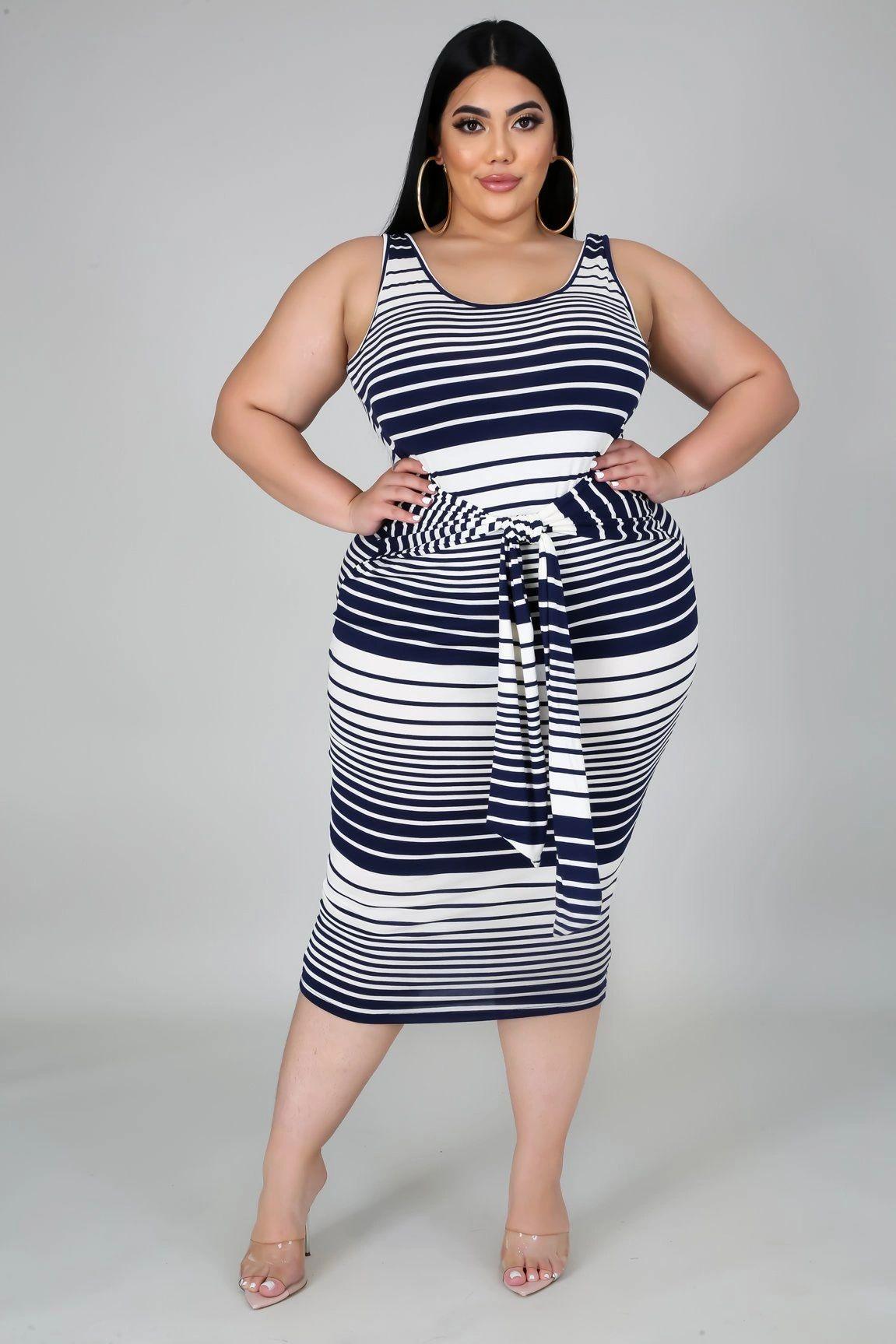 This stripe tie midi dress features, a stretchy fabric, round neckline, self tie waist strap, no closures. Hand wash cold waterDo not bleachPlus Size MODEL STATSModel is wearing a 1XHeight: 5.6"Bust:45" / Waist:36" / Hips:52"