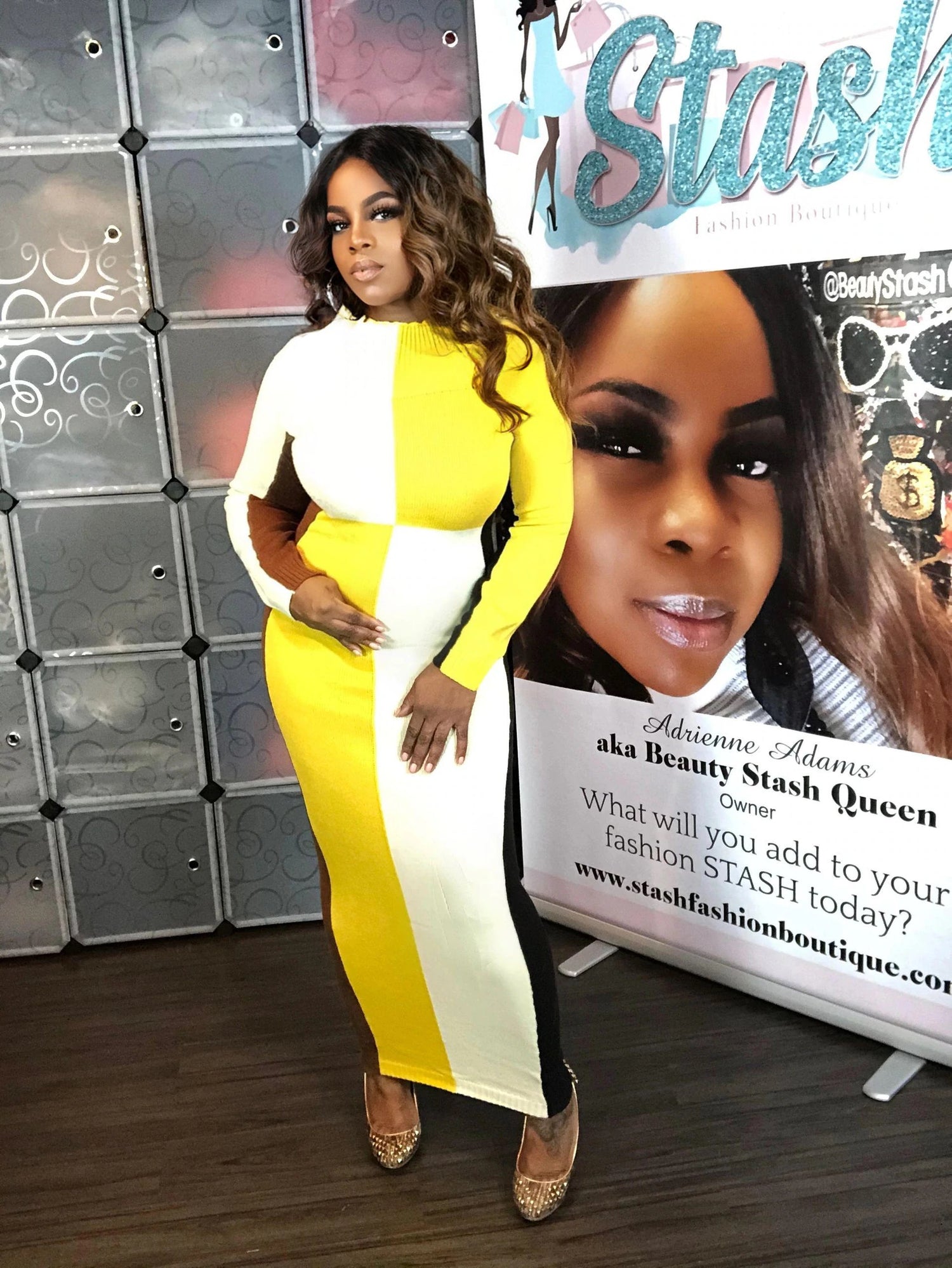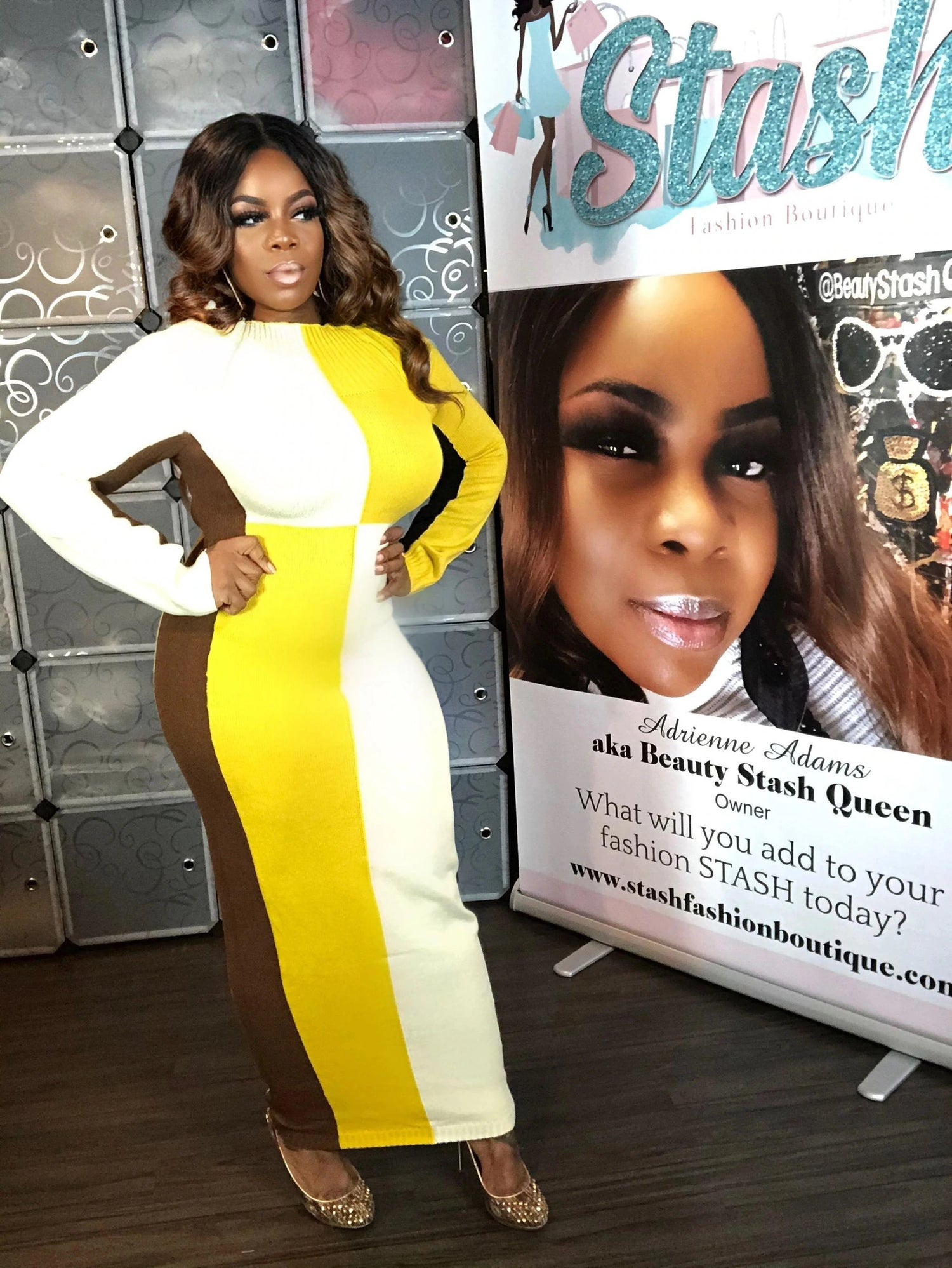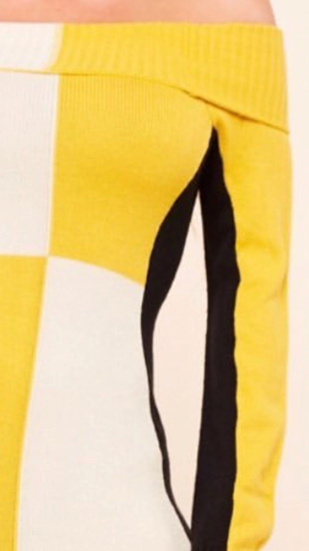 Off the shoulder, full length, sweater dress. Mustard yellow, cream, brown and black.