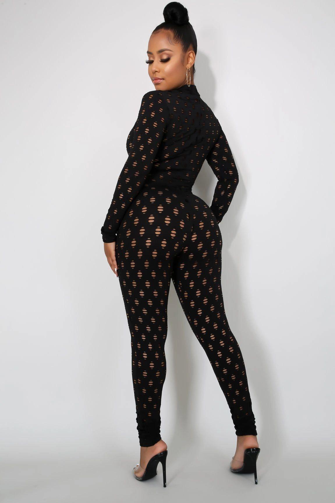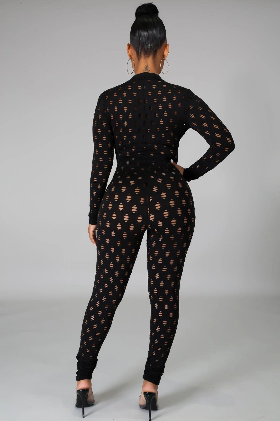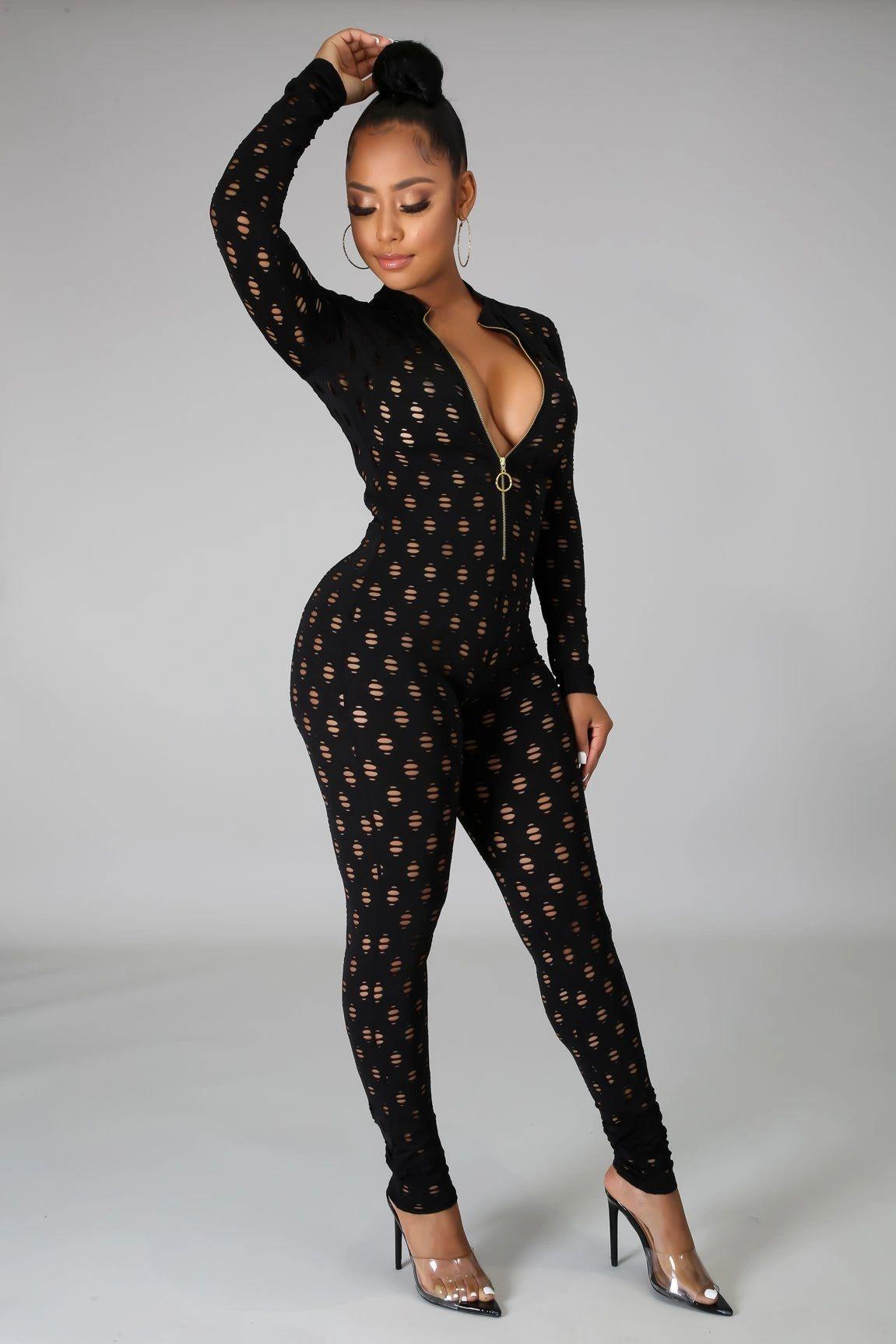 stretch jumpsuit Long sleeve Zipper closure Sheer Inseam 32 inches 95% Polyester 5% Spandex Model wearing a 1X Standard MODEL STATS:Model wearing SmallHeight: 5.5"Bust:34" / Waist:27" / Hips:42"Plus MODEL STATSModel is wearing 1XHeight: 5.6" Bust:45" / Waist:36" / Hips:52"